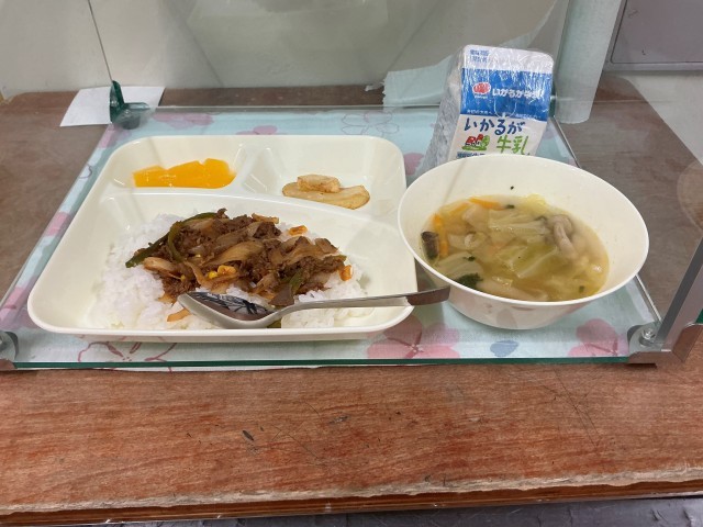 今日の給食は、「ビーフケチャップライス、フライドポテト、キャベツのスープ、ダイスゼリー(みかん)、牛乳」です。
