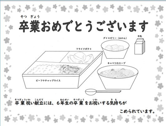 今日の給食は卒業お祝い献立です。日本では紅白が祝いの色とされ、祝いの席でケチャップライスやオムライスを食べる習慣があります。
