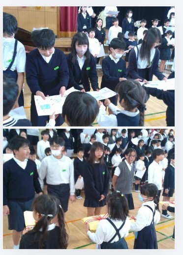 また、在校生からはメッセージカードのプレゼントを渡し、6年生からは在校生にぞうきんのプレゼントがありました。