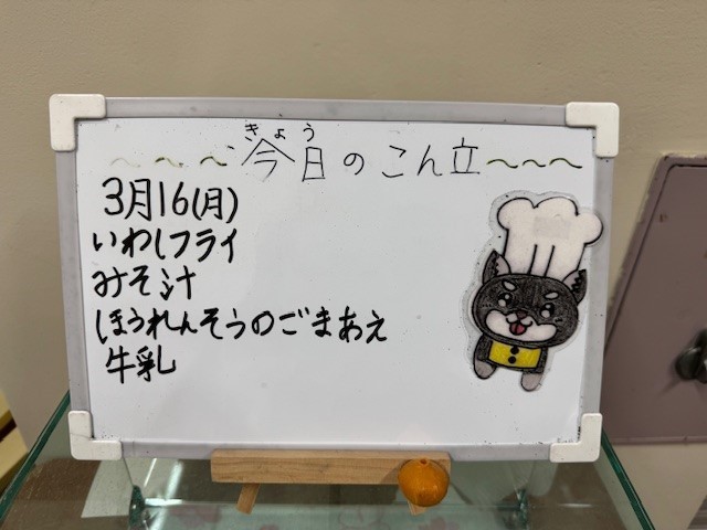 今日の給食は、「いわしフライ、みそ汁、ほうれんそうのごまあえ、ごはん、牛乳」です。