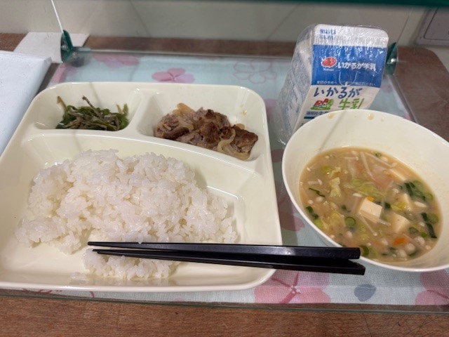 今日の給食は、「豚肉の甘辛焼き、とうふのみそ汁、じゃこピーマン、ごはん、牛乳」です。