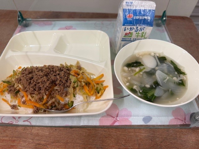 今日の給食のビビンバの具は、コチジャンで味付けしたひき肉ときゅうり、にんじん、切干しだいこん使ったナムルでした。
