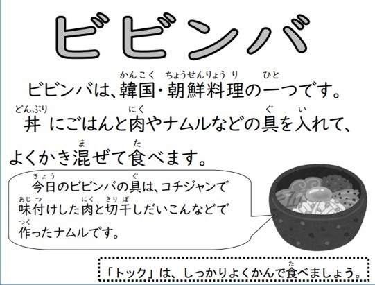 今日の給食は、「ビビンバ、トック、牛乳」です。