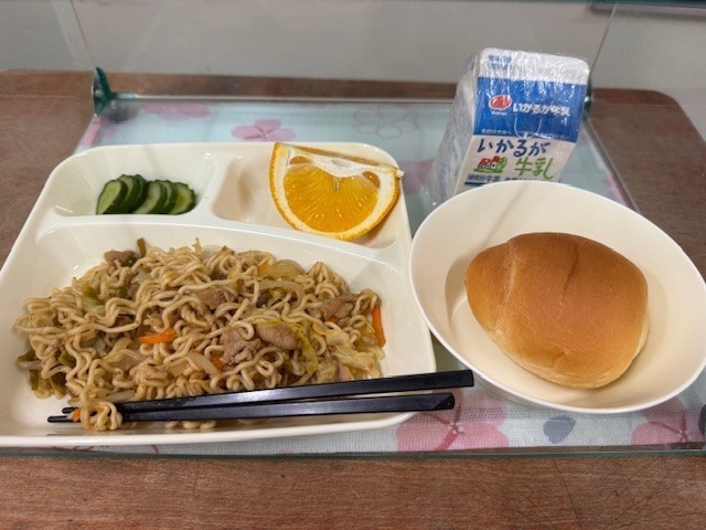 今日の給食は、「焼きそば、きゅうりのしょうがづけ、あまなつかん、ミニコッペパン、牛乳」です。