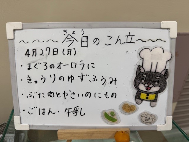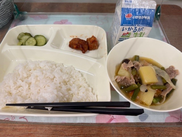 今日の給食は、「まぐろのオーロラ煮、豚肉と野菜の煮もの、きゅうりのゆず風味、ごはん、牛乳」です。