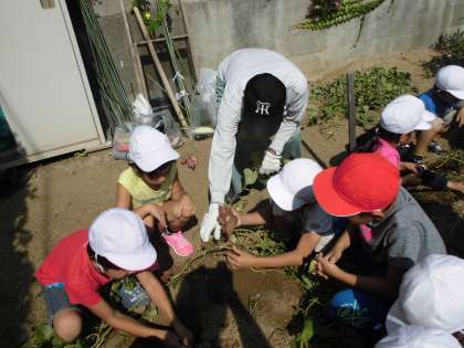 近年、核家族が多くなり、祖父母と同居している子どもは少なくなりました。また、近所に祖父母が住んでいるという子どもも限られています。日常的に高齢者と接する機会が減っているのです。このような生活環境に暮らす子どもたちにとって、自分の祖父母以外の高齢者とふれ合うことは、小さな子どもたちとふれ合うということと同様に、とても大切なことです。今回のように、サツマイモの栽培を通してお世話になることで、高齢者に対する感謝の気持ちも育ちます。また、お世話いただいた方からは、「子どもたちといも掘りができて楽しかった。」という感想もいただきました。