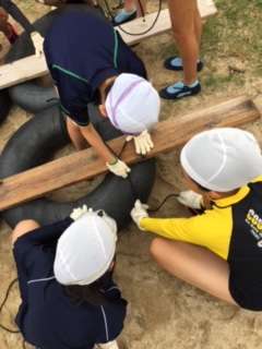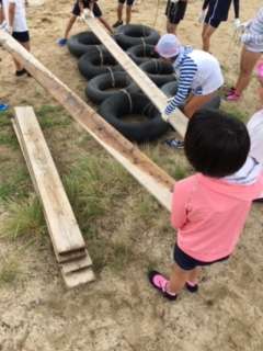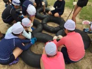 6つのタイヤをロープでつなぎ、タイヤと板を結びます。ロープを協力して、ばってんにクロスさせ、本結び!