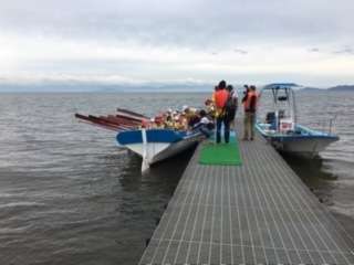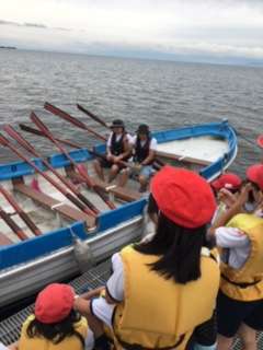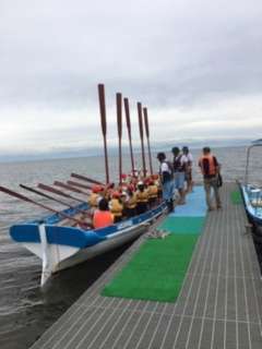 重たい櫂を二人一組で操ります。