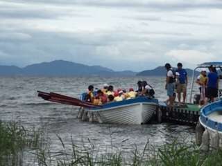 カッター体験のA班は、向かい風、波の高い中、目的地の鳥居まで行き、戻ってきました。よく頑張りました。