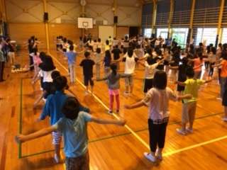 雨天のため、野外に出られないので、同宿の小学校と合同で朝の会