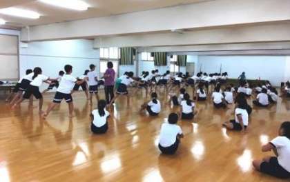 「上体を低くした状態で」「クレヨンしんちゃんのアクション仮面のポーズをイメージして」等、担任先生のアドバイスを受けながら、練習に励んでいます。「ドッコイショ、ドッコイショ」「ハッ!」等の掛け声も力強く、息が合ってきました。