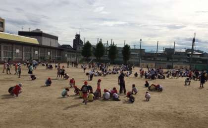 9月5日の児童朝会は、全校児童で運動場の石拾いをしました。