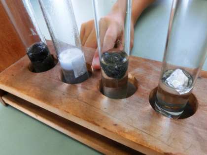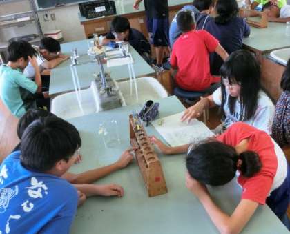 子どもたちは、薬品に入れた金属が溶ける様子を、熱心に観察していました。