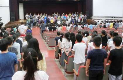 1〜5年生が、広島へ行く6年生にメッセージを送りました。