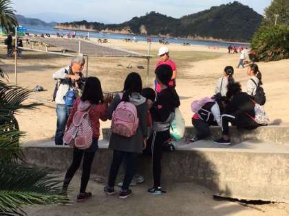 大久野島の別名は、ウサギ島!午前の活動までの時間、うさぎとふれあいました。