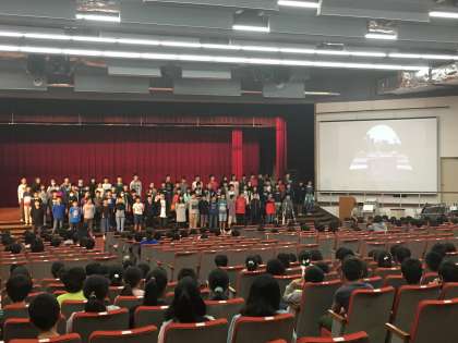 10月31日の児童朝会で、6年生が広島で学んだことを後輩に伝えました。