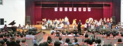 11月15日(金)、遠里小野小・東粉浜小・大領小・清水丘小・墨江小の4年生と山之内小の5年生ならびに本校の4年生が、本校講堂に集い、合唱と合奏を発表しました。
