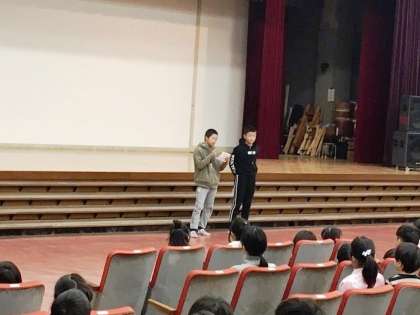児童集会で、保健委員が、「20分の休み時間に換気をしましょう」と、呼びかけました。