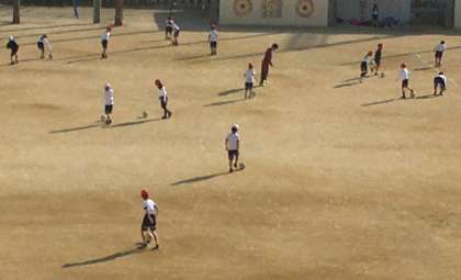 2年生の子どもたちは、ドリブルで走ります。笛の合図で、先生から「右足」または「左足」、「おしり」のいずれかを指定されます。子どもたちは、指定された体の部分でボールを止めます。