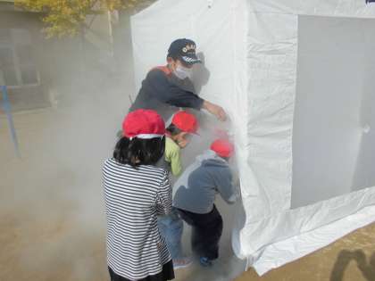 2年生は、地震に関するDVDを視聴した後、運動場に設営された煙ハウスに入って、火災時の煙を疑似体験しました。煙が充満したテントの中に入ると、1m先も見えません。無害の煙を使っているので冷静でいられますが、これが有毒な煙なら…と考えるとぞっとします。また、毛布を使って傷病者を運ぶ体験もしました。