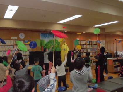11/19(水)、本校のブックハウスにおいて、ブックハウス実行委員会主催の「秋の読書まつり」が開催されました。本校児童のほか、地域にお住まいの高齢者や就学前のお子さんを連れたお母さん等、約200名にものぼる参加者で大盛況でした。実行委員のみなさんによる紙芝居の読み聞かせやペープサート(紙人形劇)、クイズ等、盛りだくさんの内容で、参加者も大満足でした。特に、ゲストを迎えての「皿回し」の演示にはみんなが惹きつけられ、やんやの喝采でした。みんな、自分でもやってみたくてうずうずしている様子が手に取るように分かります。その後の皿回し体験は、大いに盛り上がりました。