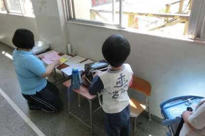 各教室の前で、担任が「健康観察表」で体調の確認を行います。