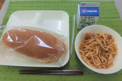 メニューは、「コッペパン、アプリコットジャム、牛乳、スパゲッティミートソース」です。