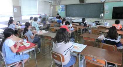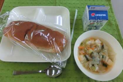 メニューは、「黒糖パン、牛乳、五目汁」です。