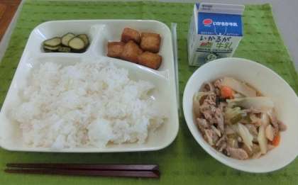 メニューは、「中華煮、あつあげのピリ辛じょうゆかけ、きゅうりの中華あえ、ごはん、牛乳」でした。本校のごはんは、校内で炊いているので、とてもおいしいです。