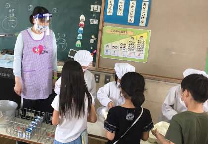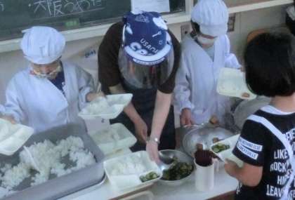 おかずの品数が増えましたが、給食当番は手際よく盛り付けていました。