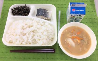 メニューは、「さごしの塩焼き、みそ汁、牛ひじきそぼろ、ごはん、牛乳」です。