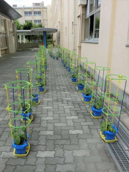 あさがおのつるが伸びてきたので、支柱を立てました。