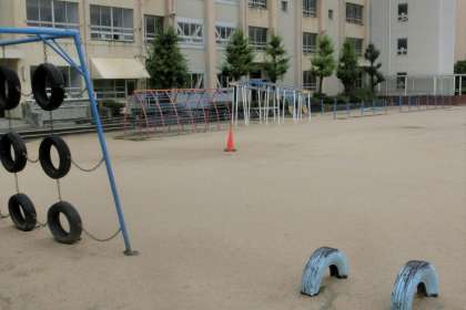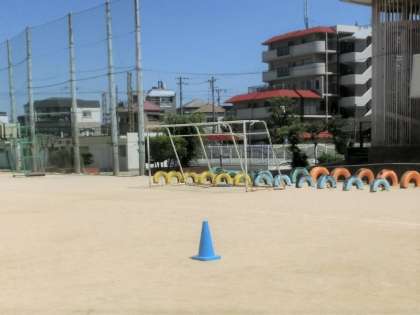 赤色のコーンは、雨でぬかるみ、運動場が使用できない場合に立てます。