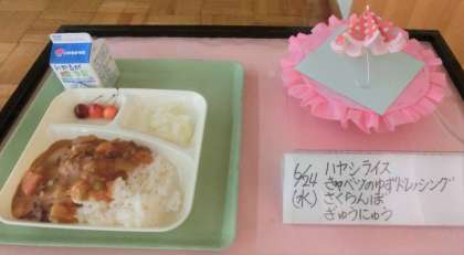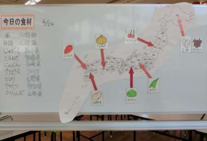 本日の給食の献立は、「ハヤシライス、キャベツのゆずドレッシング、さくらんぼ、牛乳」でした。給食ホールに、食材の産地を示した日本地図を掲示しています。自分たちの食べる物がどこから来たのかを知らせることで、食に対する関心を高めてもらいたいと考えています。