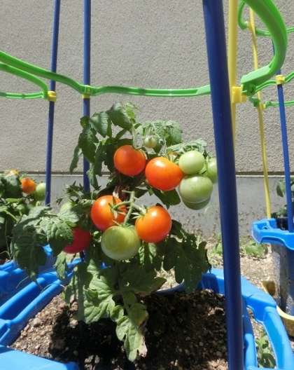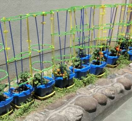 7月2日、2年生が育てるミニトマトは背丈が高くならないタイプで、実は横方向にできていきます。たくさんの実が成って、重さで倒れそうなトマトも見られるので、支柱を立てました。