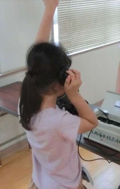 左右のそれぞれの耳で、「高い音」「低い音」を聞きとります。音が聞こえたことを、手をあげて知らせます。