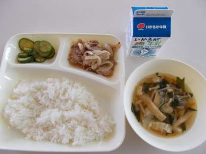 「五目汁」は、鶏肉、うすあげ、キャベツ、にんじん、えのきたけ、わかめを使った具沢山の汁ものです。