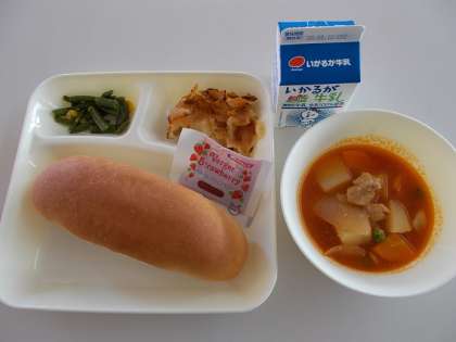 「ケチャップ煮」は、鶏肉を主材に、じゃがいも、たまねぎ、にんじん、青みにグリンピースを使用し、ケチャップなどで味つけします。