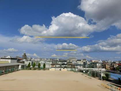 太陽の強い光によって熱せられた蒸し暑い空気が、どんどん空高く昇っていき、ある高さになると、空気に含まれた湿気(水蒸気)が冷やされて水滴や氷の粒になって雲になります。一定の高さから入道雲ができるので、入道雲の底は、黄色の線で示したように、平らになっていますよ。