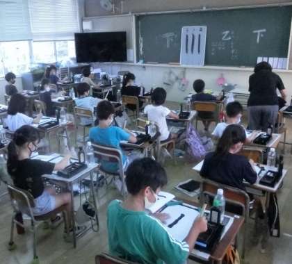 「トン、スー、ピタ」のリズムで、たての線を書きます。