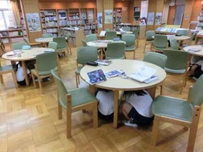 訓練情報の着信音や同報系防災行政無線で、机の下に身をかくし、頭を保護する訓練のみを行った学級もあります。
