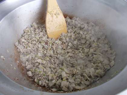 みじん切りのしょうがとにんにく、小口切りにした白ねぎとゆでた豚バラ肉をよく炒めてから、ピーマン、キャベツと合わせて炒めます。