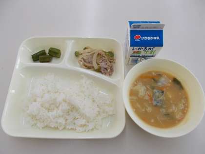 「みそ汁」はとうふ、キャベツ、にんじん、もやし、えのきたけ、わかめを使用しています。