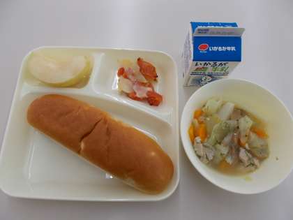 これに、旬の果物の「20世紀なし」を1人1切れ組み合わせています。今日も全員分の芯を切り取りました。1年・2年生分は皮もむいておきました。食べ残しがなかったので、うれしかったです。