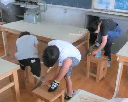 初めて使うノコギリに最初は苦労しましたが、コツをつかむと上手に切っていました。