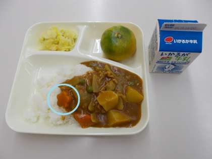 今日の「ポークカレーライス」は、小麦粉アレルギーの児童も食べることができるように、米粉のカレールウを使っています。