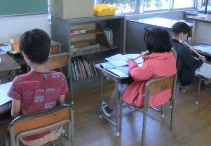 リコーダーの練習は、教室と隣りの学習室を使って、対面にならないように窓や壁に向かって行います。