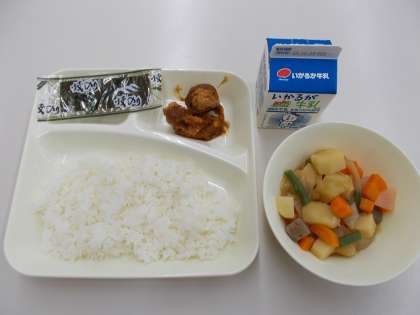 「みそカツ」は、豚の角切り肉を使って作りました。給食室で肉に下味をつけて、衣をつけて、パン粉をつけて、油で揚げた手作りですよ。みそだれには八丁みそと赤みそやみりんなどを使いました。
