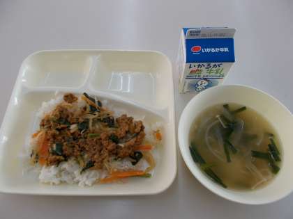 「ドライカレービビンバ」は、去年度の学校給食献立コンクール優秀賞作品をもとにした献立です。献立のねらいは、「栄養を考えて野菜を多く使い、見た目でも食欲がわくように、みんなが好きなカレーを韓国・朝鮮の料理と少しアレンジして考えました。いろいろな国の食について考えるきっかけになってほしいと思っています。」とのことです。