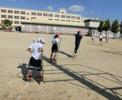 「竹馬遊び」、バランスをとって真っすぐに歩けるようになると、白線で引かれた曲線に挑戦します。
